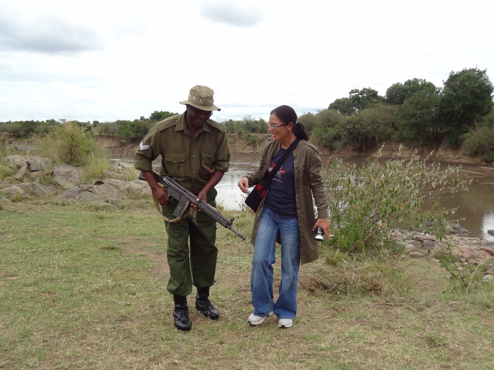 Ardından Masai Mara Park içerisinde yolculuğumuza devam ettik. Ancak parktan çıkmadan önce yapılacak bir şey daha var. O da parkı korumakla görevli bir rangerı nehir kenarında sizi yürüyerek gezdirmesi için ikna etmek. Cüzzi bir bahşiş karşılığında görevli bizi nehir kenarına kadar götürdü. Tabii size bu esnada boynunda asılı tüfeği ile eşlik edip rehberlik yapıyor.
