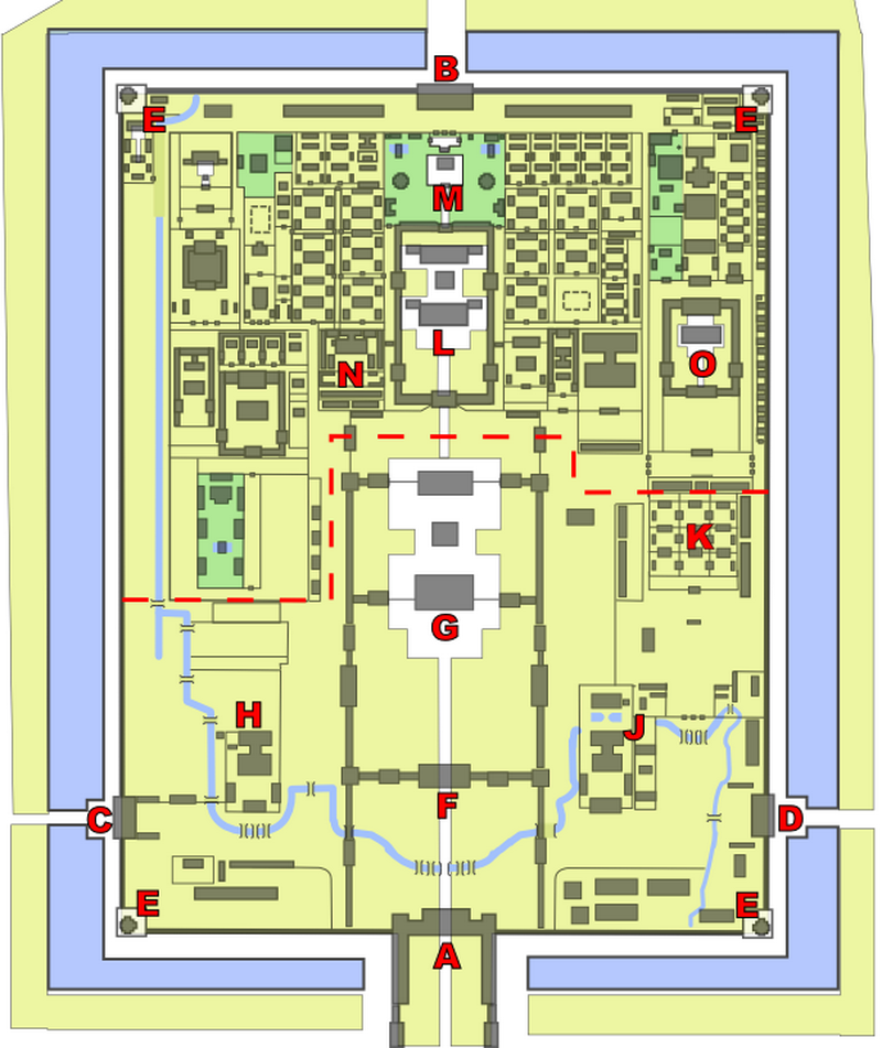 Saray ilk yapıldığı zaman halk ve imparator ailesi çok yakın yaşıyorlarmış. Yani halk istediği zaman sarayın bulunduğu bölgeye gelip gezebiliyormuş. Ancak belli bir zaman sonra imparatorluk ailesi halktan korkmaya başlamış. Hatta sarayın kuzey tarafındaki tüm ağaçları biri arkasına saklanıp suikast düzenler diye kestirmişler. Saray kompleksinin etrafını dikdörtgen şekilde 4 kilometre uzunluğunda ve 9 metre yüksekliğindeki surlar ile çevirmişler.