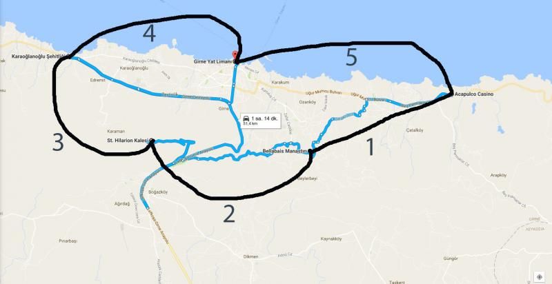 Birinci gün rotası sırasıyla 1 numara kaldığımız otelden Bellapais Manastırı, 2 numara Bellapais Manastırı-St Hilarion Kalesi, 3 numara St Hilarion Kalesi-Karaoğlanoğlu Şehitliği, 4 numara Karaoğlanoğlu Şehitliği-Girne Kalesi ve Yat Limanı, 5 numara ise Girne Kalesi'nden otele dönüş şeklinde. Bu rotayı kullanmak isterseniz yukarıda vermiş olduğum linkte başlangıç noktasını kendi konaklayacağınız oteliniz olarak seçip sırasıyla yol tariflerini alabilirsiniz. Ayrıca rota üzerindeki yerlerin sıralamasını da kendi başlangıç noktanıza göre değiştirebilirsiniz.