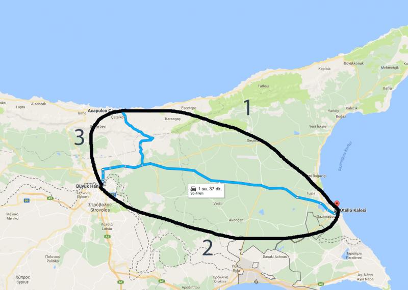 İkinci gün rotamız ise sırasıyla 1 numara otelden çıkış-Gazimagusa, 2 numara Gazimagusa-Girne Kapısı ve Büyük Han, 3 numara ise Lefkoşa’dan otele dönüş şeklinde. Yukarıda bahsettiğim yol tarifi yöntemi bu rotayı kullanmak isteyenler için de geçerli.