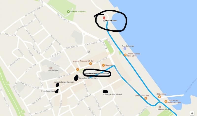 Hemen yukarıdaki arkadaşı ise Gazimagusa’da gezilmesi gereken yerlerin birbirlerine ne kadar yakın olduğunu göstermek için ekledim. Zira bir önceki haritada birbirine çok yakın oldukları için görünmüyorlar.