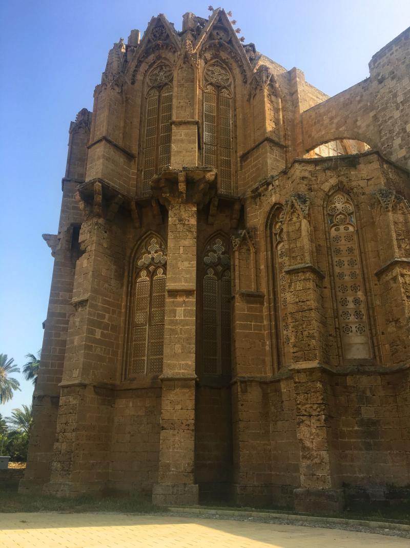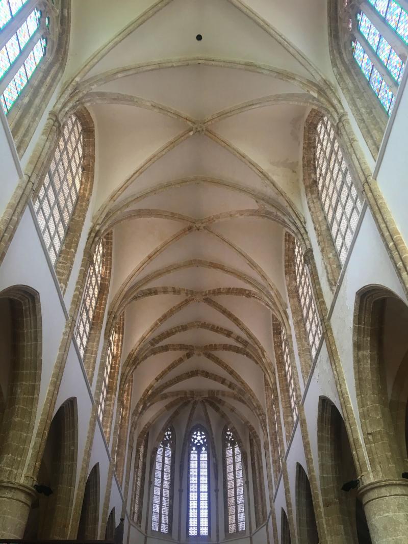 1200’lü yıllarda kilise olarak inşa edilmiş ve tam bir Gotik mimari örneği olan bu cami Fransızlar tarafından yapılmış. Lala Mustafa Paşa’nın Kıbrıs’ı fethinden sonra camiye çevrilmiş. Uzaktan baktığınız zaman bir Ortaçağ kalesini andırıyor ve yakından görme isteği uyandırıyor. O sebepten bu mekânın, zaten görülecek yerler listesinde yer alan bir mekân olduğunu öğrendiğimde çok çok sevindim. İçerisi cami gibi dekore edilmiş olsa da, içeri adım attığınızda sizi karşılayan ince uzun bir açıklık ve yüksek çapraz tonozlar, buranın aslında bir cami olmadığını kanıtlar nitelikte.