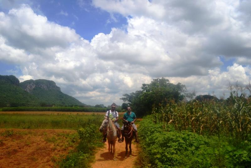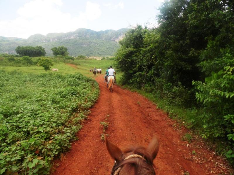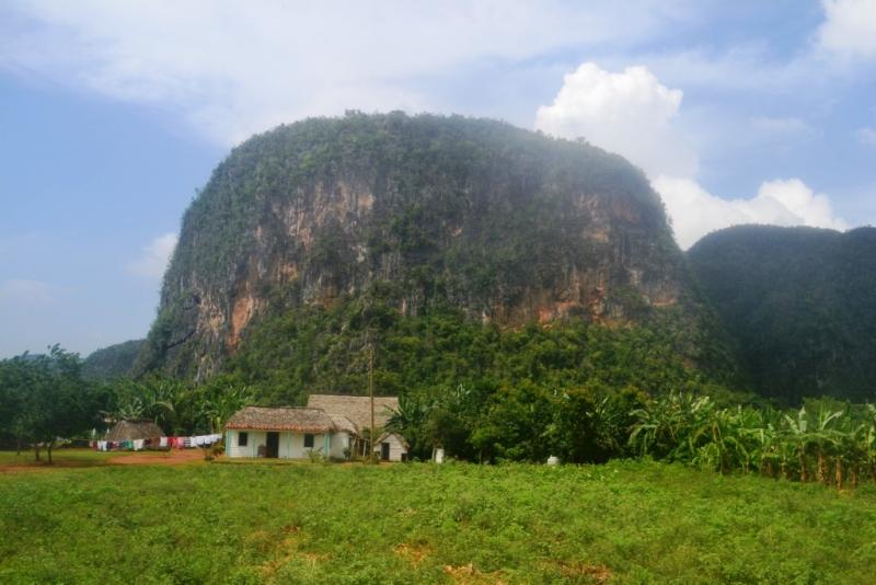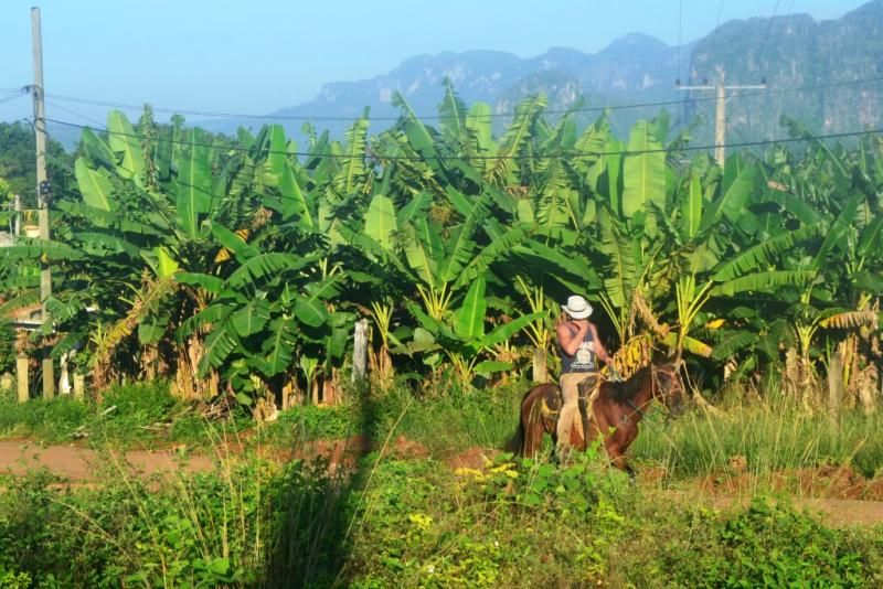 Burası Küba’nın en batı ucundaki Pinar Del Rio şehrinin şirin bir kasabası Vinales. Bugünümüzün ölmemesi ve kasabaya erken varmamız dolayısıyla merkeze yürüyerek bir tur şirketi ile görüştük ve bugün için 3 saatlik bir at turu satın aldık. Doğa tutukunlarının geldikleri yer olduğu her halinden belli. Kişi başı 15 Kuk (45 TL) vererek 3 saatlik unutulmaz bir at turu yaptık. Yeşil orman içerisine girip patika yollardan mağaraların olduğu büyük bir vadiye girdik. Arada atlarımızı bağlayarak tütün yapraklarının nasıl kurutularak sarıldığını gördük, arada bir de tropik meyve sularını içmek için kamp yerlerine uğradık. Yanımızda gelen rehberimiz ise tam bir kovboy tipi olan bir arkadaştı. Buradaki vadide dağ biçimini almış kayalar var ve ilginçtir bu kayaların tamamına doğa, yeşil bir şapka giydirmiş. Yani kayaların tamamı yeşile bezenmiş durumda. Kayalığın bir bölümünde ise turist akınına uğrayan 120 metre yüksekliğinde boyanmış bir kayalık bölüm var. Bu boyalı kaya, tarih öncesi Duvar Resmi’ni simgeliyor. Evrimin ammonitten dinozora, oradanda homo sapiense ilerlediğini betimleyen küçük bir evrim haritası yani.