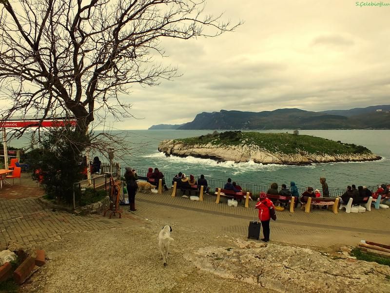 Çok merak ettiğim hemen solda gördüğünüz Ağlayan Ağaç bölgesindeyiz. Amasra’nın nemlenme etkisiyle yapraklarının verdiği tepkime nedeniyle “Ağlayan Ağaç” ismini verdikleri yer Tavşan Adası manzarasıyla da birleşince gerçekten muhteşem bir görüntü ortay çıkıyor. Genç sevgililer buraya kadar yürüyüp bu manzara eşliğinde hem çaylarını yudumluyor hem de sohbet ediyor.