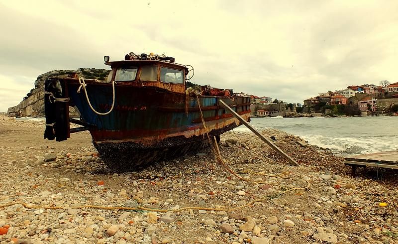 Otogardan Kale’ye doğru yürüyoruz. Otogardan itibaren uzaktan Kale’yi de seyretmek için sahile oturma grupları yapılmış. Yazın buraların çayınızı yudumlarken nasıl keyif alacağınızı görebiliyorum. Küçük limana çekilmiş bakım ve tamirat bekleyen tekneleri görünce hemen Amasra manzaralı resimlerini çekiyoruz.
