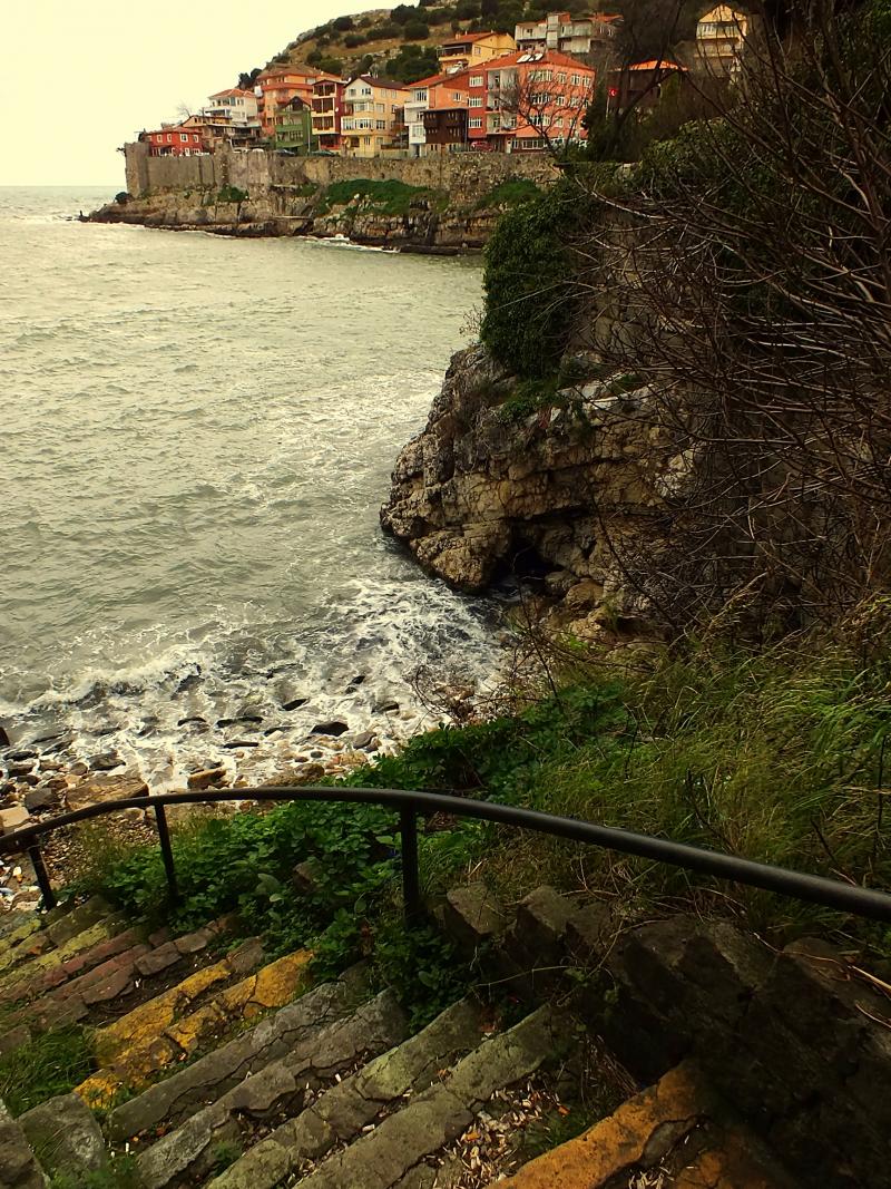 Sahil boyunca devam ederek küçük liman bölgesine geliyoruz. Burada Direkli Kaya’ya inen rengârenk bir merdiven var.