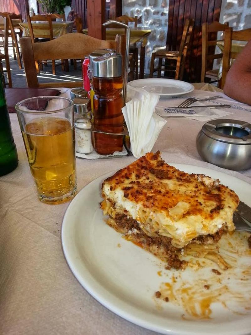 Bavulları bırakıp hemen yanı başımızdaki “taverna”ya, Netia’ya  gittik ve benim inatla “şakşuka” veya “matruşka” dediğim musakka öğlenlerim başladı. Ama çok seviyorum. Ama çok güzel yapıyorlar. Ama ben sürekli olarak yiyebilirim!! Meğerse içine beyaz şarap da ekliyorlarmış. Tarifini anlatan bir kartpostal aldım da oradan öğrendim. Oh mis : )