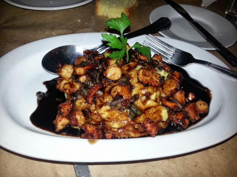 Altında ılık fava, üstünde ahtapot ve de tatlı-ekşi sos