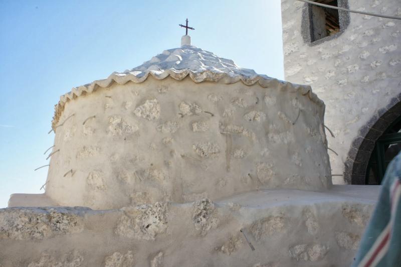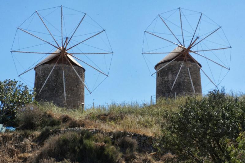 Bir baktık ki manastırın yolu dik ve merdiven. İçeride de bol bol ikona varmış. İkimize de hiç cazip gelmedi!! Bunun üzerine bol bol yürüyüp fotoğraf çektik; kafelerde oturup Türk/Yunan kahvesi içtik. Güneş canımızı acıtmaya başlayınca da bizim adamı arayıp çağırdık. Gerçekten de iki dakika sonra geldi. Manastırı gezmediğimizi duyunca çok şaşırdı, sanki biraz da bozuldu… Değirmenleri de gösterdikten sonra bizi yeniden otelimize bıraktı. Parasını ödeyip teşekkür edip kendimizi yemek yemek üzere yan komşuya attık. Gençten bir garson, o gün “pistaccio” yaptıklarını söyledi.  O ne ola ki? Ama arzu edersek “şakşuka” da servis edebilirmiş. Yok, bugün ötekini deneyelim.