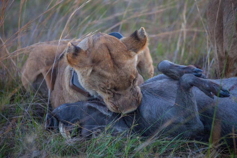 Aralarında ne bir temas ne bir ses yani görülür herhangi bir iletişim oluşmamıştı bize göre. Neler oluyor diye bakarken yattıkları yere 500-600 metre mesafede tek başına bir yaban domuzunun otladığını gördük. Biz gördük ama bu bir iki saniye sürdü çünkü bir toz bulutu yükseldi ve çalıların arkasındaki aslan domuzun boğazına saldırdı. 1 dakika içinde domuz yere yatırılmış ve nefes borusu aslanın dişleri arasında kalmıştı.