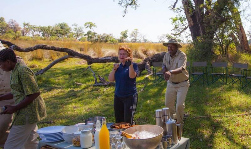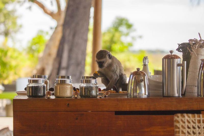 Saat 12'de kampa dönüş ve bir brunch. Bu gezilerde kilonuzu koruyabilmek için endokrinoloji uzmanı olsanız da yok olmuyor işte… Yiyecekler muhteşem. Arkadaşlarımız bize hep soruyorlar “siz orada yiyecek ne buluyorsunuz” diye. Gerçekten neredeyse parmaklarımızı yiyeceğimiz lezzette, tüm dünya mutfağından lezzetleri Afrika mutfağı ile birleştirmeyi, bunca ıssızlık içinde, nasıl başarıyorlar bilmiyorum ama hayranlık duyuyorum. Bu öğle yemeğimizde masada konuklarımız vardı, “maymunlar!”