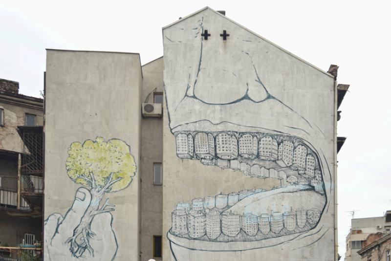 Bir diğer ünlü grafiti ise Lukina sokağında bulunan “The City That Ate Greenery” yani “yeşillik yiyen şehir”. Bu grafiti Brankova sokağına bakıyor. “Super Wall” yani Süper Duvar projesi kapsamında bu grafiti ile tanıştı. Blu adını kullanan ve gerçek kişiliğini gizleyen sanatçı İtalyan asıllı. Dünya çapında duvarları tuval olarak kullanan Blu, fırça kullanmıyor. Elbette bu kadar büyük bir grafitiyi fırçayla yapması zor olabilir. Onun yerine rulo kullanıyor. Birçok şehirde grafiti yapan sanatçının bütün çizimleri birbirine benziyor çünkü hepsinde tüketim toplumunu eleştiriyor.