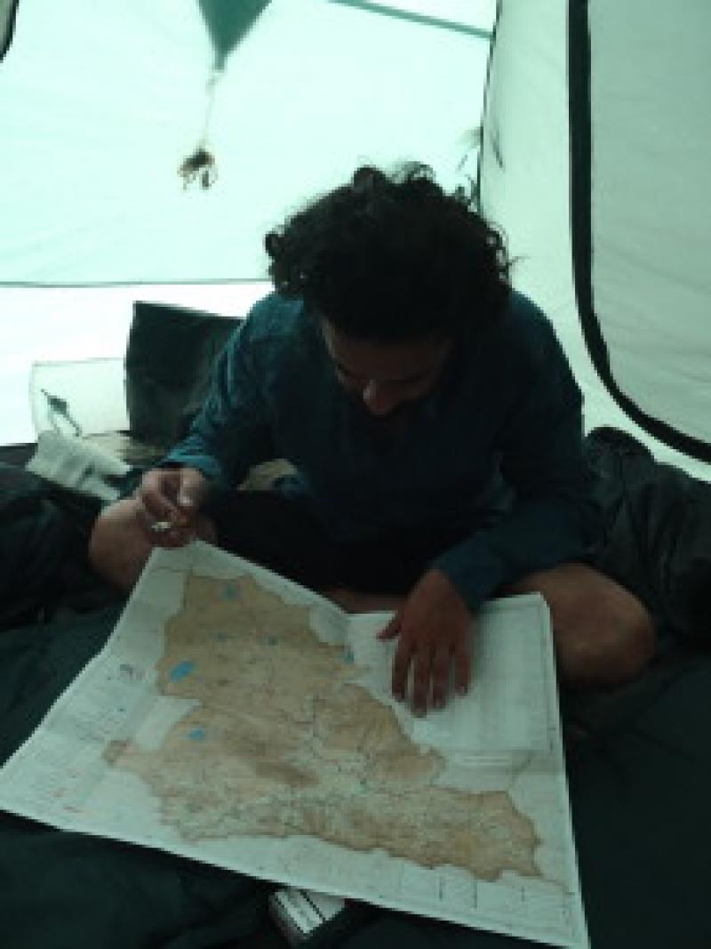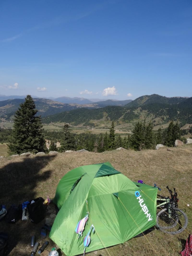500 metre sonra güzel bir manzara görünce çadırımızı kuruverdik. Birden rüzgar bir bastırdı. Çadırı yerinde tutmak imkansız. İnanılmaz bir rüzgar. Rüzgarın yönüne doğru çivilerle kuvvetlendirince iyileşti ama yine çadırın iskeletinden gıcırtılar gelmeye devam etti. Ben dedim "bugünü bu çadır atlatırsa eğer benim favorim olacak." İçeride yiyecek bir şeyler hazırladık.