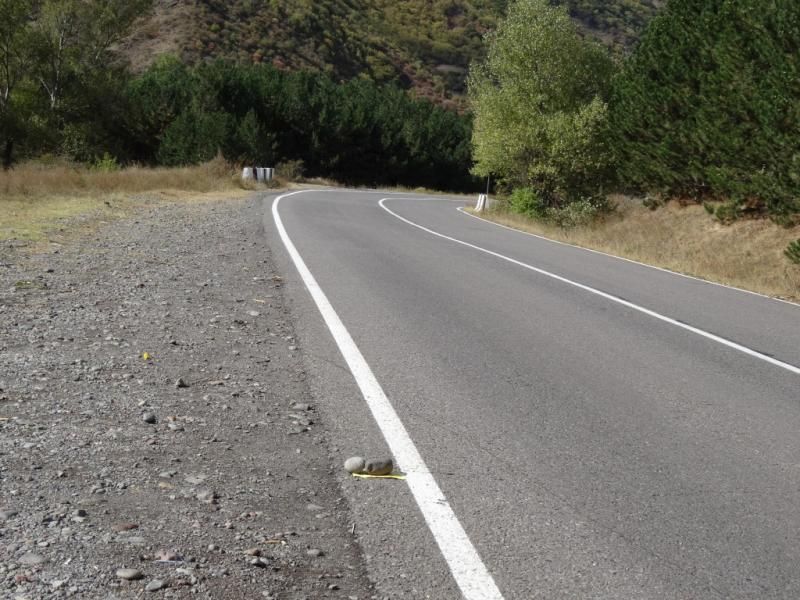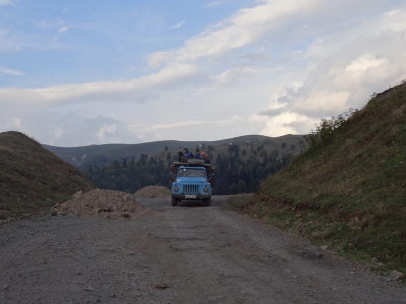 İşçi lokantası tarzında bir kafe bulduk. Şarjlarımızı edip, birer Türk Kahvesi, birer de bira patlattık. 2250 metre çıkışın inişi patika olunca zar-zor yola devam ettik. Yolda Türkiyelilerin çalıştığı şantiyeden yemeğe davet ettiler. E zaten biz şantiyeden kaçmıştık, bir de tok olunca geri çevirip patika yokuşa çıkmaya başladık. Lastikler ve bisikletlerimizin türü bu yola hiç uygun değildi. Biraz gitmeyi denedik ama olmadı. Yağmur başlayınca bir durağa sığınıp otostop çekmeye başladık ki ilk müsait araba durdu. 30 kilometre yolu otostopla devam ettik. Yol o kadar yorucuydu ki arabanın içinde bile yorulduk.