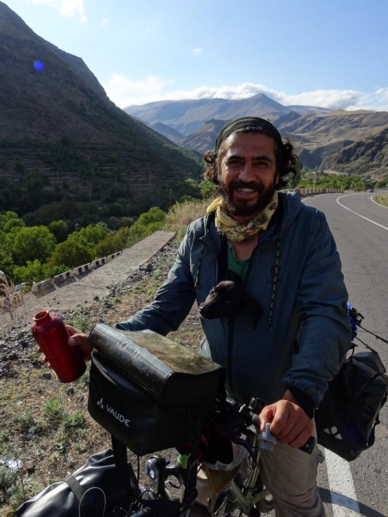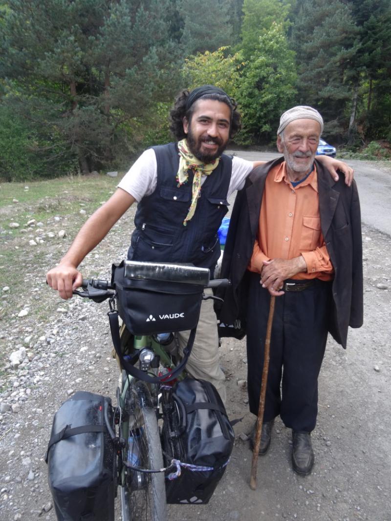 35 kilometre boyunca taşlık yolda iniş. Bir pedal basmadık desek yeridir. Yolda bir çobanla rastlaştık: Mehmet Dede… Bana ‘sakla sakla’ diye bağırınca durduk tabii. Azerbaycan’da da dur demekti. 83 yaşında ana dili gibi Türkçe biliyor. Acarlardanmış. Evine davet etti. Biz de kibarca reddettik. Biraz ileriye gidince iki tane Hollanda plakalı karavan su dolduruyorlar. Bütün İpek Yolu boyunca geçmişler şimde de Hollanda’ya doğru gidiyorlarmış. Bizden Türkiye hakkında detaylı bilgi aldılar, bizi de tebrik edip yola devam ettik. Sıcakkanlı insanlar. Bir de az da olsa Rusça bilmeleri garibime gitti.