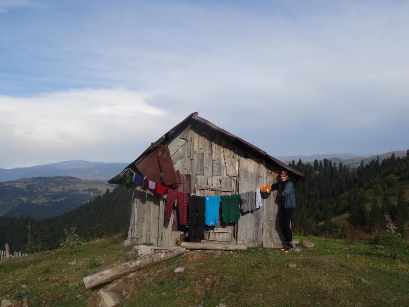 Aşağıdaki evlere baktığımızda neredeyse nokta büyüklükteydi. Tam bir Karadeniz manzarası… Kuru ve temiz giysimiz kalmadığından artık çamaşır yıkamalıydık. Hani karı eline alırsın da ellerin kıpkırmızı olur, işte öyle bir soğukta çamaşırları yıkadık. Tertemiz oldular. Sıra bizdeydi ama o soğuk suda asla yıkanmam :) Suyu güneşte ısıtalım desek bulutlarda güneşi kapatmış. Neyse o fikirden vazgeçtim. Çamaşırları terkedilmiş bir odunluk deposunun önüne astık. Saat 11’de Ahmet ağabeyle sözleştik ama güneş sukoyverdi. Saat henüz 9 iken ufaktan bir hovardalık yapıp kızartma yapalım dedik. Nasıl olsa patatesler bol. Hayatımda yediğim en güzel kızartmalardan biriydi. Tabii teyzeminkinin yerini tutamaz. Çamaşırlar kurumayınca baktık ki saatte 11, çıkalım yola derken 12.30 gibi varmışız eve.