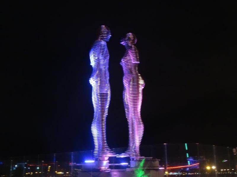 6 saat sonunda Batum’daydık. Gürcistan, Türkiye vatandaşlarına 3 ay vize veriyor. Hatta bilindiği üzere kimlikle de giriş yapabiliyorsunuz. Artvin’den küçük bir ücretle sınırı geçebilirsiniz. Bazen girişte şarap bile armağan edebiliyorlar Batum’a sahilden bakınca küçük Las Vegas gibi duruyor. "Sahile kamp kuralım" dedik. Bir kerede denize nazır bizim evimiz olsun, değil mi yani? :) Limandan yaklaşık 5 dakika sürdükten sonra Ali ve Nino’nun Aşk heykeline rastlayınca kitlenip kaldık. Uzun süre izledik kavuşamamalarını… Hikaye de öyleydi ya; Bir Azeri delikanlıyla bir Gürcü kadın savaştan dolayı asla kavuşamıyorlardı, Kurban Said‘in hikayesinde. Kafkasların Romeo ve Juilet’i… Gerçekten mühendislik harikası ama ondan önce derin yaşanmışlıklar vardı. Azerbaycan, Gürcistan ve Ermenistan bu hikayeyi sahipleniyorlar.