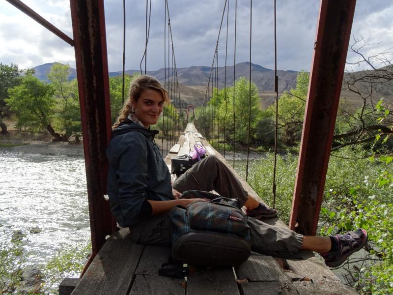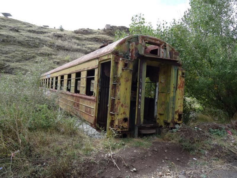 Yol hep yokuş. Biraz da ağırlık fazlalaşınca zorlanıyor tabii insan. Nehir boyu giderken bir köprü gördük ki bir benzerini daha asla göremeyiz sanırım… Adamlar tren vagonunu alıp köprü yapmışlar, Akhalkalaki’ye 3 kilometre kala. Sonradan anlaşıldı ki buradaki tren hatlarını iptal edip küçüklü büyüklü vagonları halk ev olarak bile kullanıyor. Hatta dükkan bile yapmışlar.