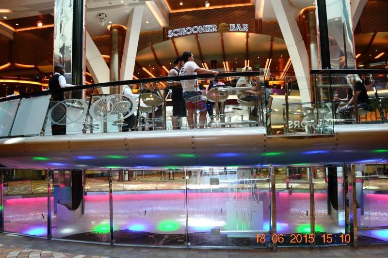Geceleri eğlenmek, vakit geçirmek için geminin kıç tarafındaki 1380 kişilik büyük bir amfitiyatroda her akşam değişik şovlar izlemek mümkün ama tatil köylerindeki gibi basit değil, ciddi güzel şovlar. Bir akşam “Mamma Mia” müzikali vardı ki gerçekten oyuncular profesyonel ve müthiş seslerdi, kendimi Broadway’de sandım. Başka bir salonda ise her akşam buz pateni gösterisi var, görmeye değer, gerçekten gençler çok başarılı. Bunun dışında belki 10 bar ve hepsinde ayrı bir aktivite; caz, Latin, piyano, karaoke bar gibi, sizlere eğlenceli vakit geçirecektir. Tüm bu hizmetler, içki hariç ki içmek mecburiyeti de yok elbette, ücretsiz olarak sunulmakta. Her gemide olduğu gibi bu gemide de epeyce Türk personel var ve biz Türk müşterilerine özel muamele ile süper ve ayrıcalıklı servis veriyorlar.