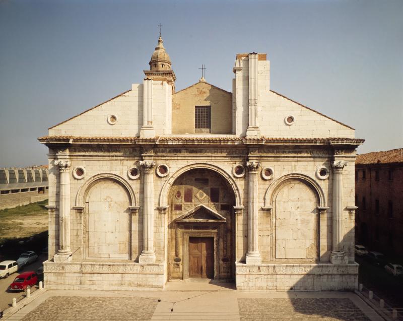 LEON BATTİSTA ALBERTİ, SAN FRANCESCO KİLİSESİ (TEMPİO MALATESTİANO). RİMİNİ. 1450’DE BAŞLANMIŞTIR. CEPHENİN BİR KÖŞESİNDE YAZAN KİTABEYE GÖRE, SİGİSMONDO MALATESTA KENDİ MOZOLESİNİ TANRI’YA VE RİMİNİ KENTİNE ADAMIŞTIR. ONUN KİŞİSEL İŞARETLERİNİN BELİRGİNLİĞİ FARKLI AMAÇLARI DÜŞÜNDÜRMEKTEDİR.