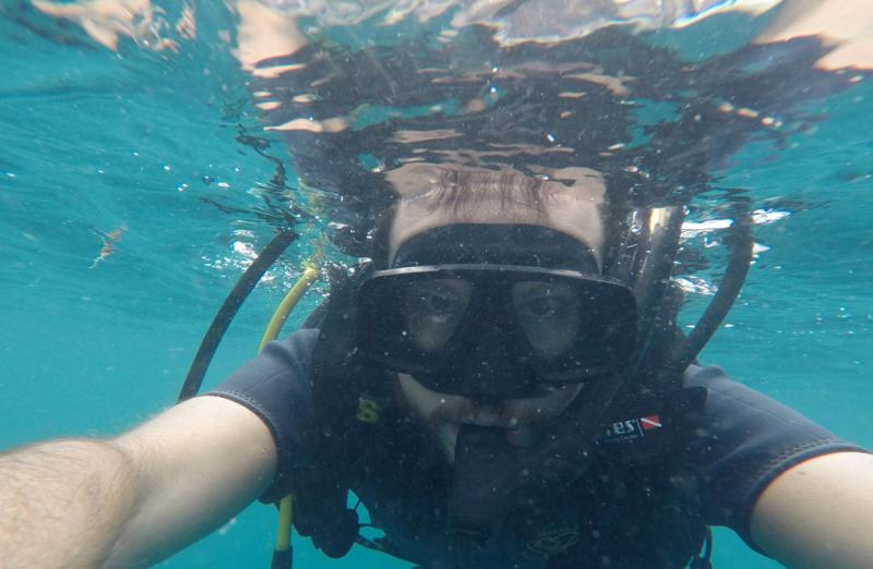 Öğleden sonra eğitmenim Thomas ile tanışıp, derse başlıyoruz. İlk günkü ders teorik. Eğitim videoları izliyorum. Toplamda 5 adet olan konuların 3 tanesi bitiyor. Ev ödevi olarak 3 tane de test veriyor. Pazartesi sabahı bir gün önce izlediğimiz videolardaki konuları bir de Thomas’tan dinliyorum. Yaptığım soruları kontrol ediyor. Öğleden sonra ise nihayet ayağım suya değiyor ama tatlı suya. İlk dalış denemeleri havuzda yapılıyor. Size tavsiyem, mümkünse havuzda başlamanız, ekipmanlar yabancı olduğundan mutlaka su yutuluyor. Yuttuğunuz su tuzlu olursa çok da hoş şeyler olmuyor :)