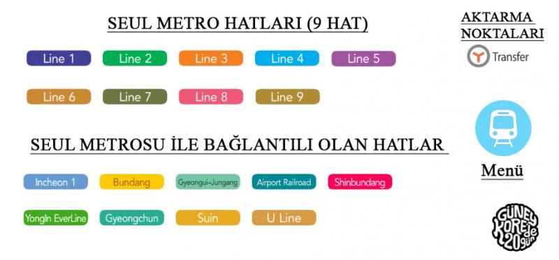 Evet gelelim Metro hattına... Kore'de Seul, Busan, Daejon, Daegu ve Gwangju şehirlerinde metro hatları bulunmaktadır... Seul, 9 Hat ve bunlara bağlı ayrı 9 Hat ile başı çekiyor... Karışık gibi geliyor ama mantığını bir kere anladığınızda aslında çocuk oyuncağı ve her yere çok kolay ulaşım sağlayabiliyorsunuz.