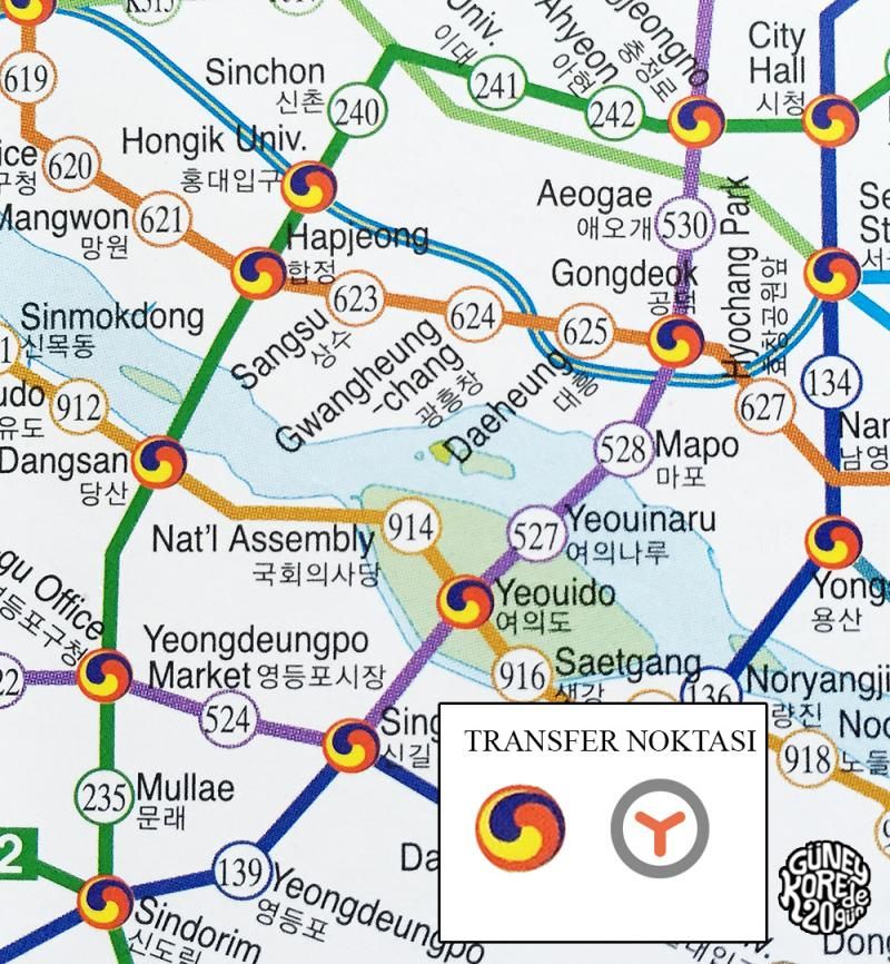 Her hattın kendine ait bir rengi var ve her hatta belli noktalarda aktarma durakları bulunmakta bu sayede bu 9 Hat kusursuz bir biçimde birbiri ile bağlantılı..Seul metrosunun bana göre kalbi olan hat 2 numaralı yeşil hat (yanlışım yoksa ilk yapılan hat diye biliyorum hatta Reply drama serisinde esprili bir sahne vardı). Görselde gördüğünüz gibi uygulama içerisindeki transfer noktaları turuncuT gibi bir şekilde görünüyor. Transfer noktasına geldiğinizde haritadan hangi hatlarla bağlantılı olduğunu görebilirsiniz. Transfer/aktarma noktalarında ise hangi hatta geçecekseniz o rengi takip etmeniz yeterli... (ama dikkat doğru rengi bulsanızda çift taraflı istasyonda ters yöne gitmeyin)