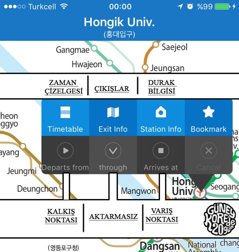 Bunların hepsini başarıp Hongik Durağı'na geldiniz ve indiniz. Evet şimdi yeni görev gideceğiniz yer ya da buluşma hangi çıkıştan olacak? Kore'de metro çıkışları pek meşhur malum... Hongik Uni 9. çıkış mesela en meşhurlarından... Ben Bupyeong Yeraltı Çarşısı'nda 30'a yakın çıkış kapısı gördüm mesela ... Neyse gevezeliği bırakayım... Şimdi yukarda bahsettiğim durak üzerine tıklayınca açılan menüde bir exit info yazısı var oraya tıkladıgınızda size bütün çıkışları gösteriyor onun dışında uyarıları takip ederekte gideceğiniz kapıyıda bulabilirsiniz... Arkadaşlarınızla buluşacaksanız hangi çıkış diye sormayı da unutmayın.