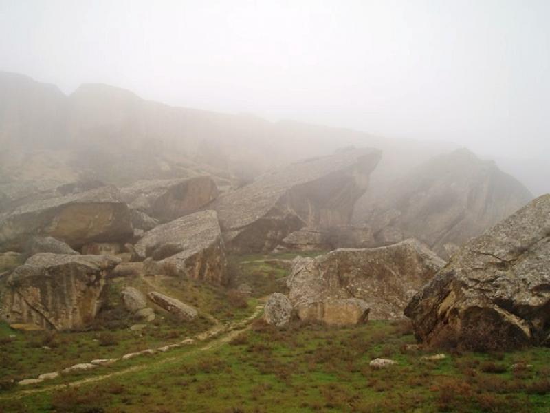 UNESCO Kültür Mirası Listesi’nde ve denizden 200 metre yukarıda yer alan Qobustan, Bakü’nün yaklaşık 60 km güneybatısında. Şeki yolundan Karabağ sapağını geçip batıya sürmek lazım. Sağlı sollu “günebakan yağı” reklamlarıyla, “Qabax (telaffuzu Kabah)” denilen döner kavşaklardan geçe geçe yol tutmuştuk. Denizin içindeki petrol platformlarıyla bakışarak kara bir bozkır boyunca gittik. Bir de gördük ki sisler içinde, kayalık yollu ilerliyoruz. Taşların cinsi, çevrenin şekli şemalı, hava sıcaklığı dönüşmeye başladı. Bafa Gölü kimi acayip bir güzergâha benzedi, pek tanıdık geldi. Havası tertemiz, sis rahatlatıyor, ortalık hafif soyuq, hatta əfsanəvi”.
