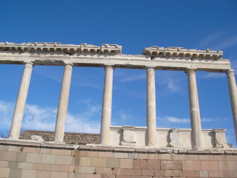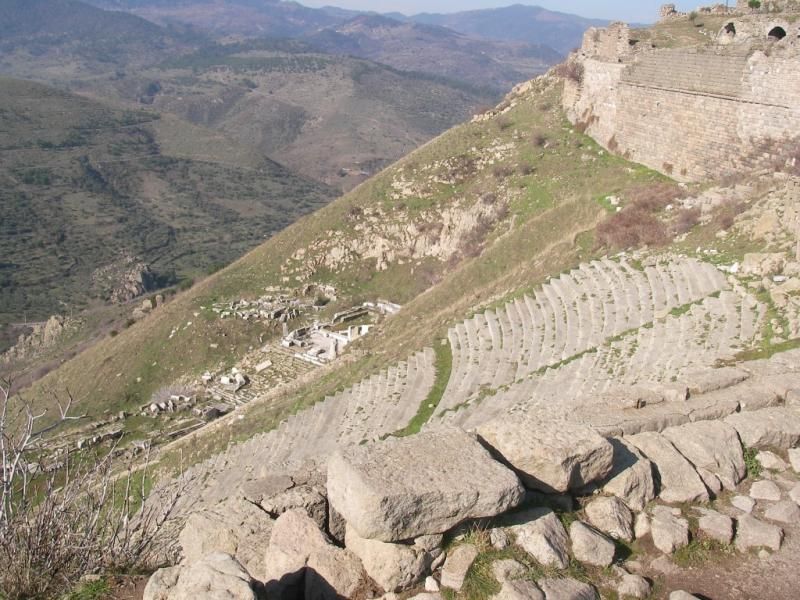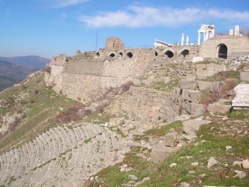 Akropol… Asiller mahallesi… Burada kral saraylarının yanı sıra komutanlar ile devlet görevlilerinin konutları vardı. Kralların ibadet etmesi için Kral Attalos zamanında yapılmış olan Heroon, şehre giriş kapısı önündeki bir avlunun etrafında inşa edilmişti. Şimdi ise sadece kalıntıları var. Akropol kapısından şehre girerek, Kral Eumenes’in sarayının önüne geliyorum. Sarayın girişinde düzgün taş bloklarla döşenmiş bir avlu, avlunun her iki yanında güvenlikten sorumlu askerlerin kullandığı odalar, ortadaki avluda bir sarnıç ve sunak, avlunun çevresinde de yaşam odaları vardı. Odalarındaki mozaiklerin en güzeli “Süpürülmemiş Oda” isimli olanıydı. Eumenes’in sarayının hemen yanında, Kral Attalos için yapılmış olan, küçük sarayı arıyor gözlerim. Ne yazık ki iki görkemli saraydan da temel kalıntıları dışında hiçbir iz kalmamış. Zeus’un karısı Hera’nın çok basamaklı bir merdivenle çıkılan kutsal alanı ise Yukarı Gymnasion’un üstündeki terastaydı. Geniş sütunlu avlunun dört yanındaki yapılardan oluşan şehrin en büyük yapı grubu Gymnasion’un içinde hamamlar vardı. Yarışlardan sonra temizlik için kullanılan yıkanma kurnaları hala duruyor. Yukarı doğru genişleyen üç teras üzerinde yer alan yapıda alt teras çocukların, orta gençlerin en üst teras ta yetişkinlerindi. Burada bir de büyük şehir çeşmesi vardı. Athena kutsal alanı ise Zeus Sunağı’nın üstündeki taraçadaydı. Athena; sanat, bilim ve şehrin koruyuculuğunun yanı sıra zaferlerin de müjdeleyicisiydi. Bizans döneminde bu alanda yapılan kilise yüzünden tapınak, temellerine kadar sökülmüş. Zeus Sunağı da Bergamalıların Galatlara karşı kazandığı zaferden sonra tüm tanrılar ve Athena adına yaptırılan “Dünya Harikası” bir sunaktı. Çevresini beş basamaklı mermer bir merdiven çeviriyordu. At nalı şeklindeki sunağın iki tarafındaki merdivenlerle çıkılan galeride Zeus’a adanan armağanların konulduğu asıl sunak yer alıyordu. Sunağın üç tarafını saran alçak duvar, atlı arabalar, atlar ve tanrı heykelleri ile bezeli idi. Sunağın duvarlarında baş tanrılar ile uzun saç ve sakallı, ayaklarının yerinde kuyrukları olan devlerin savaşı resmedilmişti. Tanrı Zeus kardeşlerini yer altı dünyasına kapatınca, yer altında yaşayan devler buna çok kızmış, yeryüzüne çıkarak tanrılara saldırmışlar ancak yenilmişlerdi. Kabartmalarda kazananlar Bergamalıları, yenilenler ise Galatları simgelemekteydi. Üç yandan sunağı saran duvarların birinde ise Herakles’in oğlu Telephus’un şehri nasıl kurduğunu anlatan kabartmalara yer verilmişti. Sunak açık mavi renkte mermer bir boya ile boyanmış, Tanrıçaların giysilerine altın veya tunçtan eklemeler yapılmıştı. Şu an bu görkemli yapı ana vatanından çok uzaklarda bir şehirde sergilenirken yerini ise iki çam ağacı koruyor. Antik dönemin en dik tiyatrolarından biri olan, on bin kişilik, müzik ve şiir dinletileri ile drama ve toplantıların düzenlendiği tiyatrosu ise diğerlerine göre en iyi durumda. Bu beni biraz mutlu etse de hala perişanım…