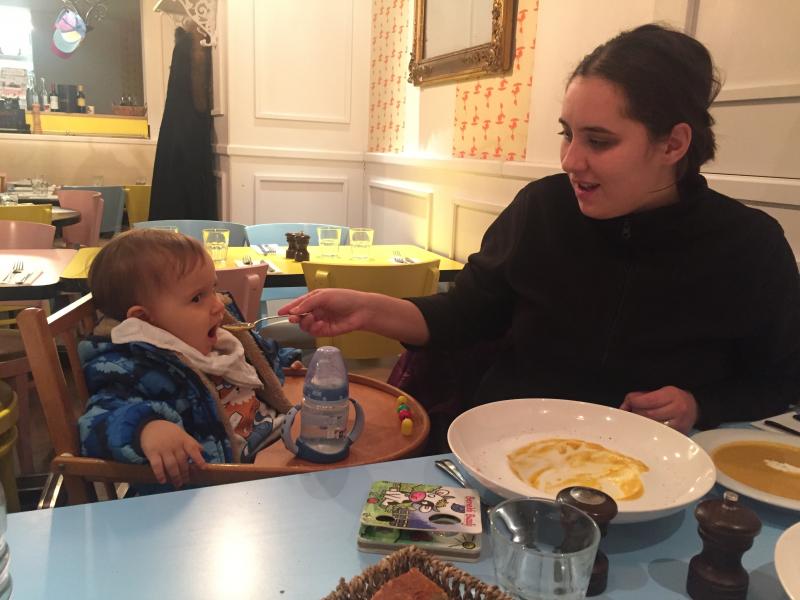 Yemek konusuna gelirsek; Fransızlarla yemek kültürümüz pek bağdaşmıyor. Hava sıcaklığının eksilerde olmasından dolayı bir çorba içelim dedik, hem Toprak’ta bir öğününde mutlaka çorba tüketir. Ama çorba bulması bizim için çok zor oldu. 5-6 restoran dolaştıktan sonra güç bela güzel bir sebze çorbası bulduk. Demem o ki artık normal yemeklere geçtiyse bebeğiniz restoranda bebeğinize göre yemek bulmak konusunda zorluk çekebilirsiniz. Biz hemen hemen her yerde bulunan Carrefour’dan kavanoz mama alıp geri kalan günlerimizi Toprak’a bunları yedirerek geçirdik.