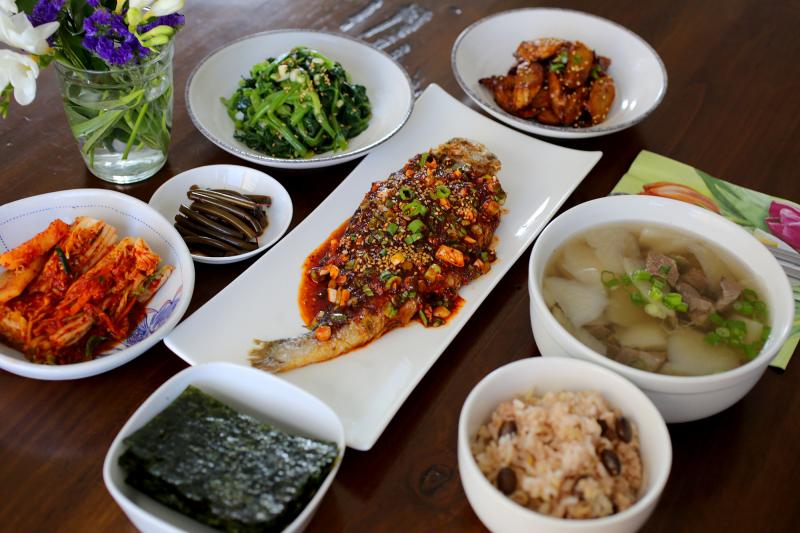 Klasik bir Kore yemeği; pirinç, sebze ve balıktan oluşuyor. İstiridye, karides ve balık çeşitlerinin çok fazla tüketildiği ülkede, kişi başı tüketim ise 59 kilo. Fotoğraf: http://www.maangchi.com
