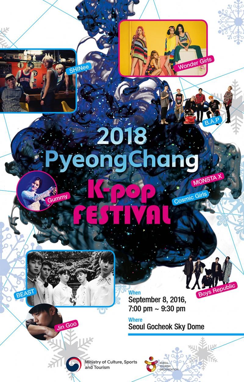 Kore Turizm Organizasyonu ve Kore Kültür, Spor ve Turizm Bakanlığı işbirliğinde 2018 Pyeongchang Kış Olimpiyatları’na dikkat çekmek için bir festival düzenleniyor. 8 Eylül tarihinde Seul’de gerçekleşecek Pyeongchang K-Pop Festival’de SHINEE, BEAST, Wonder Girls, Boy Republic gibi çok sayıda grup sahne alacak. Bunun yanı sıra festivalde ülkenin kültürünü öne çıkaran etkinlikler de düzenlenecek.