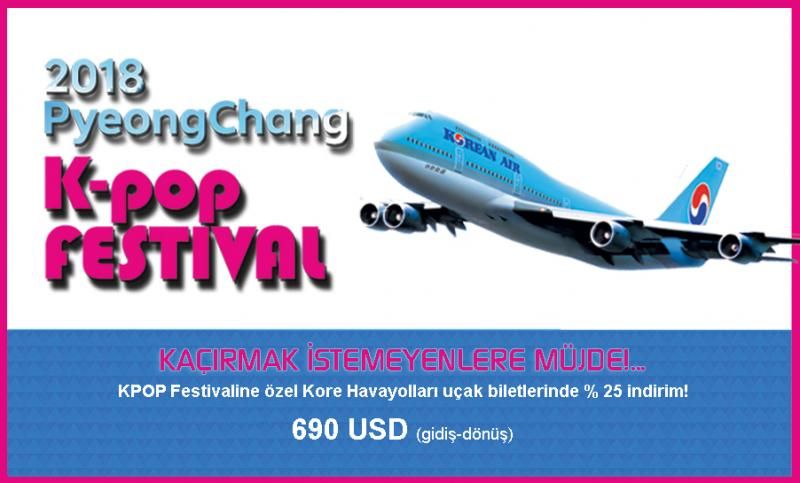 Ayrıca şunu da belirtmek gerek: Kore Havayolları, Pyeongchang K-Pop Festivali’ne özel 7 Eylül tarihine kadar yapılacak İstanbul-Seul uçuşlarında yüzde 25’lik bir indirim yapıyor. Bu indirim sayesinde İstanbul’dan Seul’e gidiş-dönüş 690 Dolar’a bilet satın alabilirsiniz. İndirimden faydalanabilmek için önce siteden başvurunuzu yapmalı, ardından bilet alımını gerçekleştirmelisiniz. Nitekim bilet alırken konser kuponunu ibraz etmek gerekmekte.