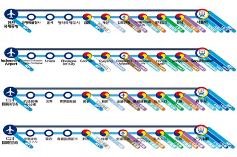 Seul Airport Railroad Express (AREX) Incheon Havaalanı'ndan iki ayrı tren işletiyor şehir merkezine. Bunların bir tanesi express giden ve hiçbir durakta durmayan bir trenken; diğeri tüm duraklarda duran ve biraz daha ucuz olan bir alternatif. Sabahın erken saatlerinden (05.30 civarı) geceyarısına kadar her 10 dakikada bir bulabileceğiniz bu trenlerin ulaşımı oldukça kolay ve fiyatları express için 8000 Won (22 TL), yavaş tren için ise çok daha az 4250 Won (11.5 TL). Çocuklar için ise express tren 6900 Won (19 TL), yavaş tren 1900 Won (5 TL) iken öğrenci bileti 3040 Won (8 TL).