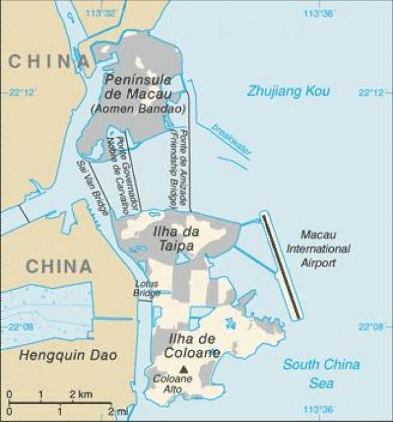 Macau şehri, coğrafi olarak, Macau Yarımadası, Taipa, Coloane bölgeleri olmak üzere 3 bölgeye bölünmüştür. Taipa ve Coloane arasında kalan Cotai bölgesi zamanla gelişmiştir ve günümüzde özellikle lüks otelleri ile turistlerin ilgisini çekmekte ve Macau şehrinin asıl kumar merkezini oluşturmaktadır.