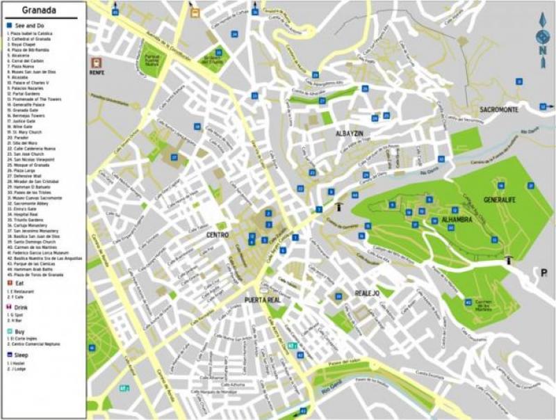 Şehri keşfetmek için en iyi yol elbette yürümektir. Özellikle merkezdeki noktaları yürüyerek gezmek Centro içerisinde mümkün. Ancak bazı noktalarda yönünüzü kaybedebilirsiniz ve dar sokaklarda arabalardan kaçmanız gerekebilir. Granada’nın yüksek noktalarına da yürüyerek çıkmak bir nebze yorucu olabilir. Araba kiralamak genelde turistlere tavsiye edilmez çünkü özellikle merkezdeki sokakların darlığı ve tek yön olmaları buraya iyi bilmeyenler için zorlu olabilir. Şehrin ulaşımı genelde otobüslerle sağlandığından, otobüsler tüm turistlerin de kurtarıcısı olacaktır. Turistik noktalara giden oldukça fazla otobüs bulabilirsiniz. Başında C harfi olan seferler şehir merkezi, Alhambra ve Albaicin’i gezerken kullanılabilir. C3 ve C4 ile Alhambra’ya, C1 ile Albaicin’e ulaşılabilir. Çoğu otobüs kuzey-güney yönündeki Gran Via Caddesi’nden geçtiği için merkeze ulaşım kolaydır. Otobüsleri kullanırken tek kullanımlık 1,20 € ödeyerek veya 7 kullanımlık 5 €, 16 kullanımlık 10 € ve 33 kullanımlık 20 € ödeyerek çoklu kullanım kartı satın alabilirsiniz.