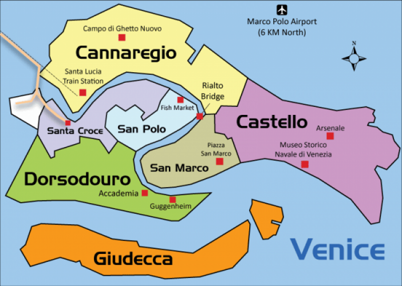 Venedik’te şehir sestieri adı verilen 6 semte ayrılmıştır. Bu bölgeler; Castello, Cannaregio, San Polo, San Marco, Santa Croce, Dorsoduro ve Giudecca adlarıyla anılır. San Marco ve Castello turistler için merkezi ve hareketli bölgeler olduğu için öncelikle buralarda kalmanızı tavsiye ederiz. Santa Croce ve Dorsoduro; Padava, Treviso, Di Plave gibi merkeze uzak ve daha sakin bölgeler olduğundan pek tavsiye edilmemektedir ancak buralarda da ulaşım ağı geniş olduğunu ve konaklama ücretlerinin daha uygun olduğunu unutmamalısınız. Dolayısıyla seyahatinizi daha uygun bir ücrete getirmek isterseniz bu bölgeleri de tercih edebilirsiniz.